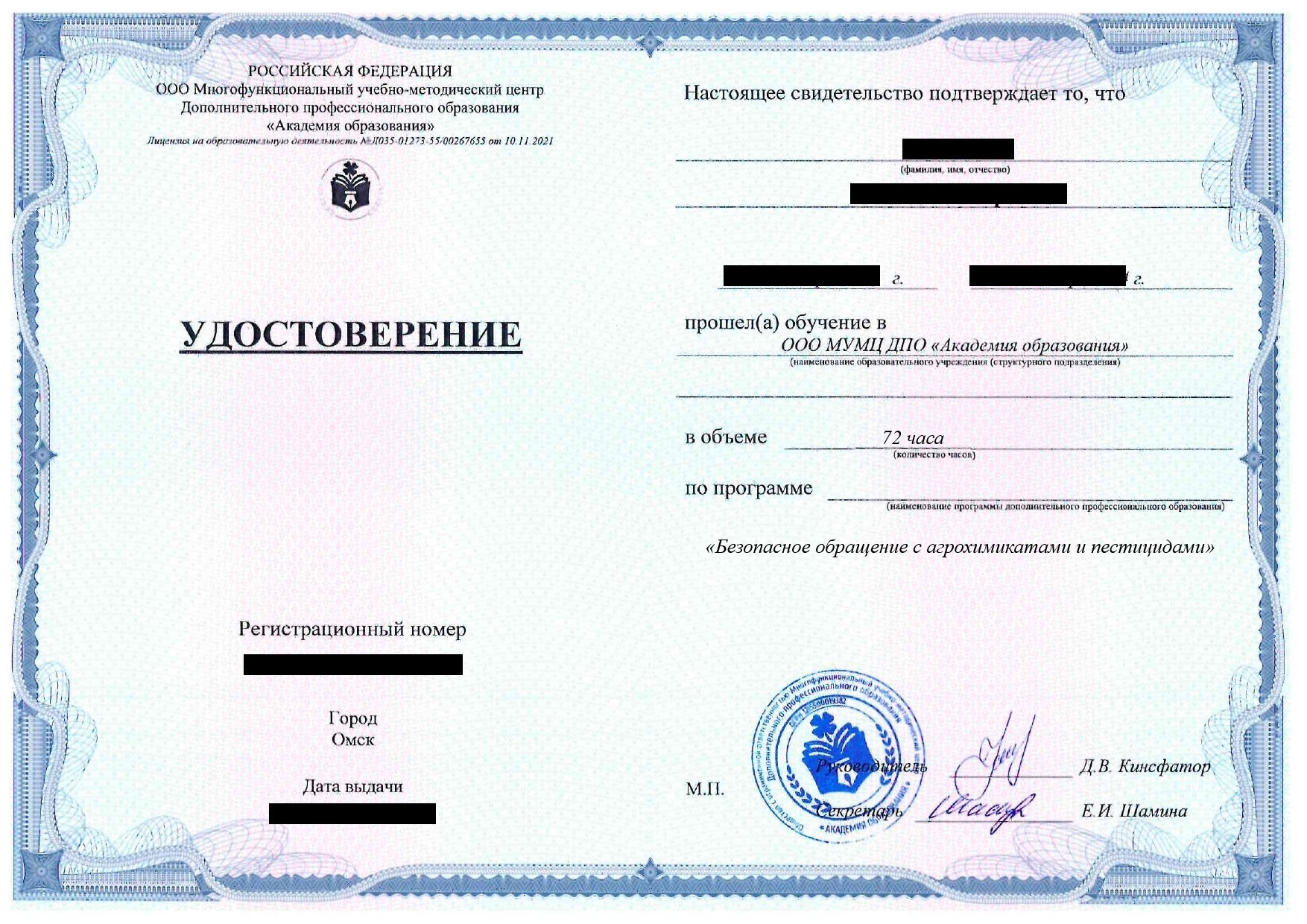 • Удостоверение о повышении квалификации (при наличии среднего профессионального или высшего образования);