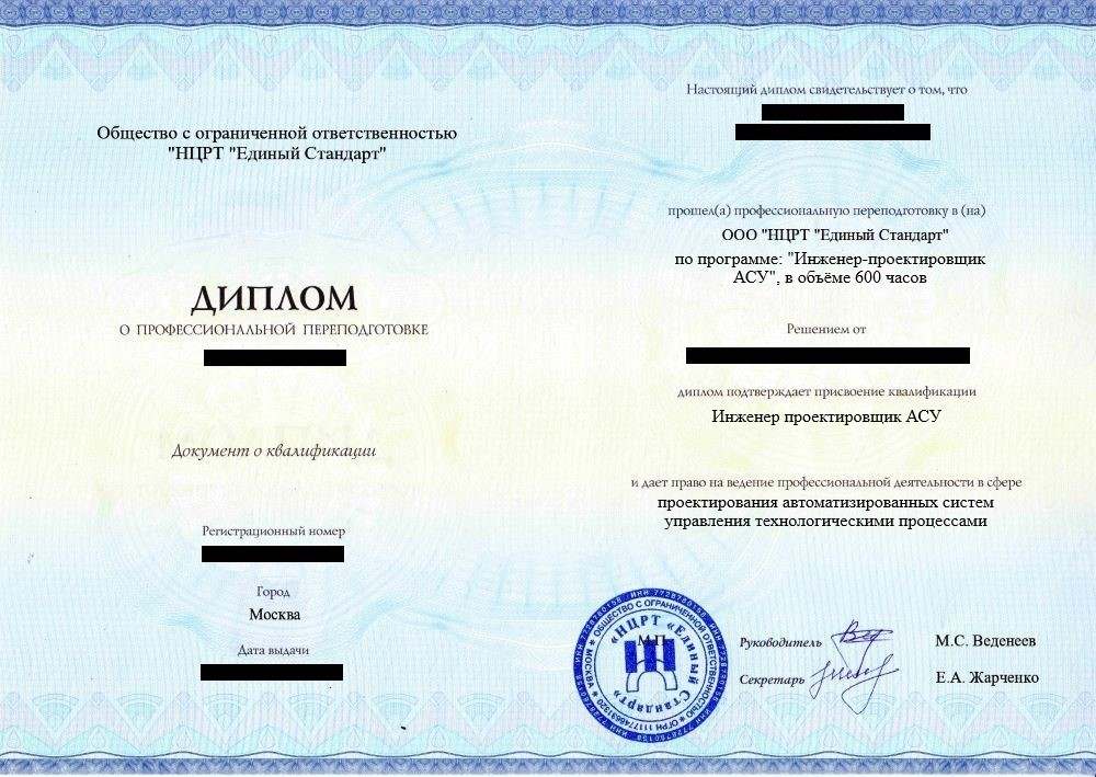 • «Инженер проектировщик АСУ» с правом ведения профессиональной деятельности в сфере проектирования автоматизированных систем управления технологическими процессами